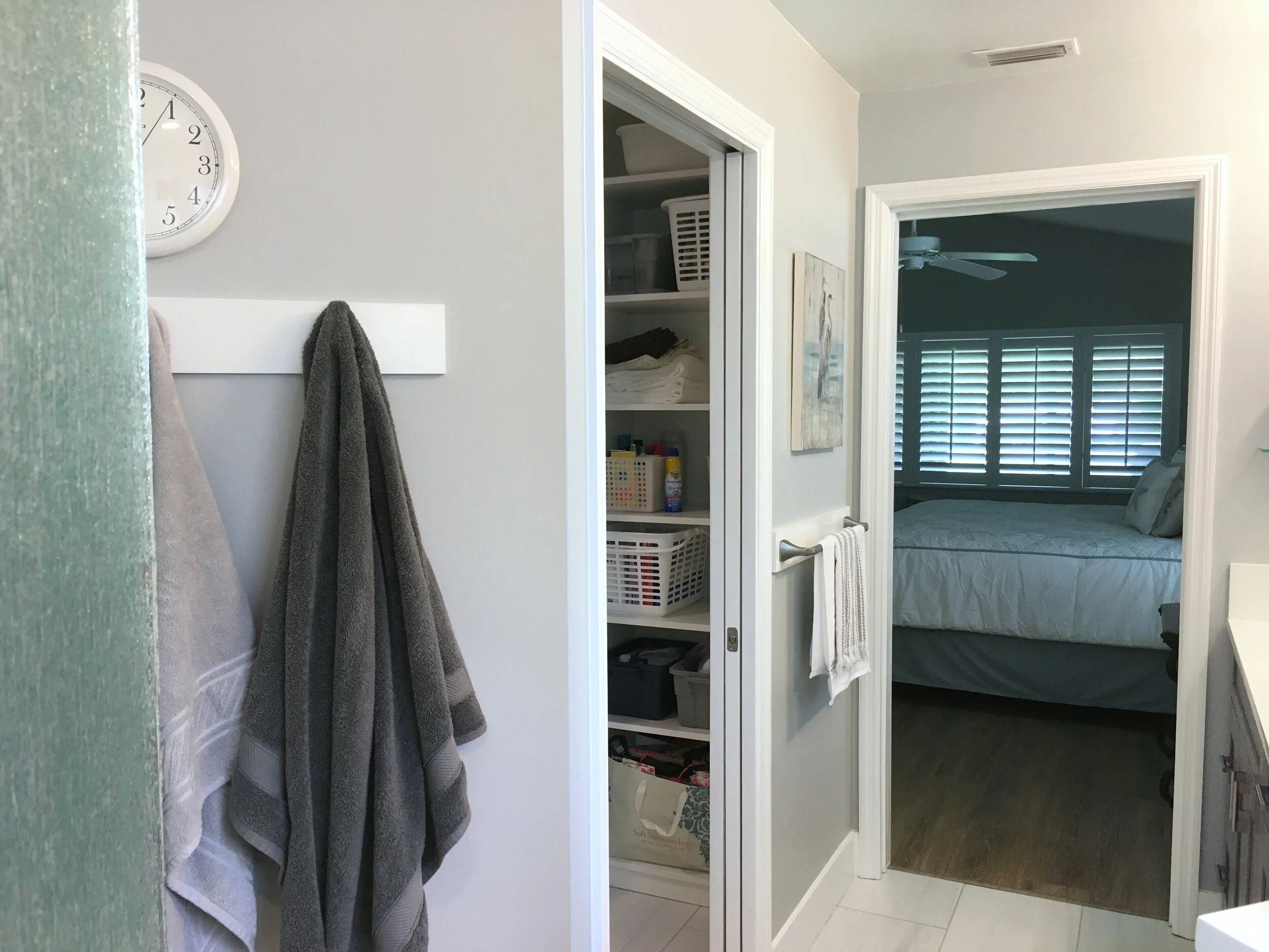 This main bathroom is one of the models in an age restricted development. It had an overly large toilet room and a convoluted plan. We re-configured a majority of the walls and doors, in order to better utilize the available space; allocating more to the adjoining laundry room and main closet. While maintaining a good sized shower, the closet now affords enough space for the majority of the couples’ clothing. The couple moved to the area recently and wanted a coastal Florida feel to their new home.